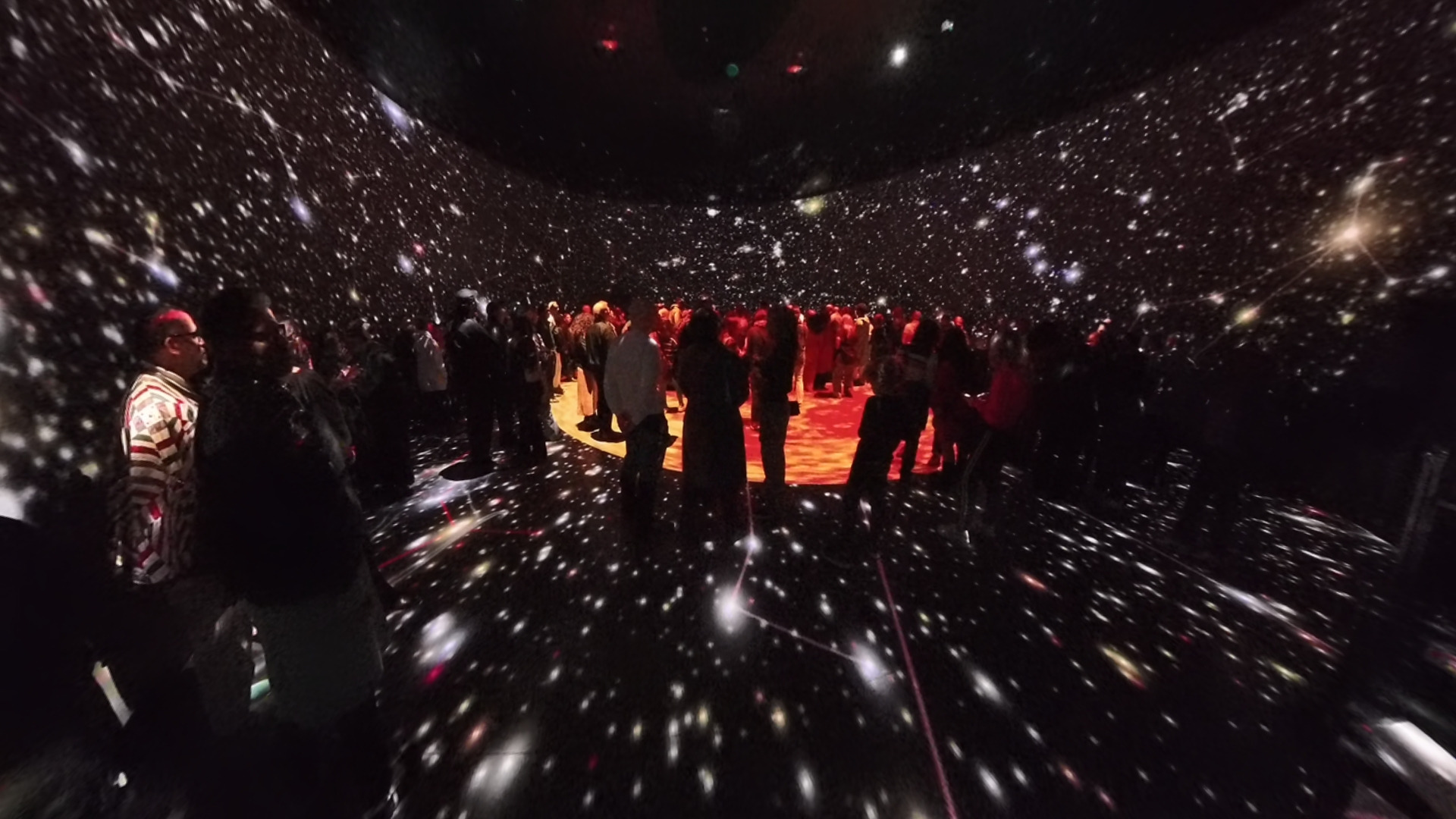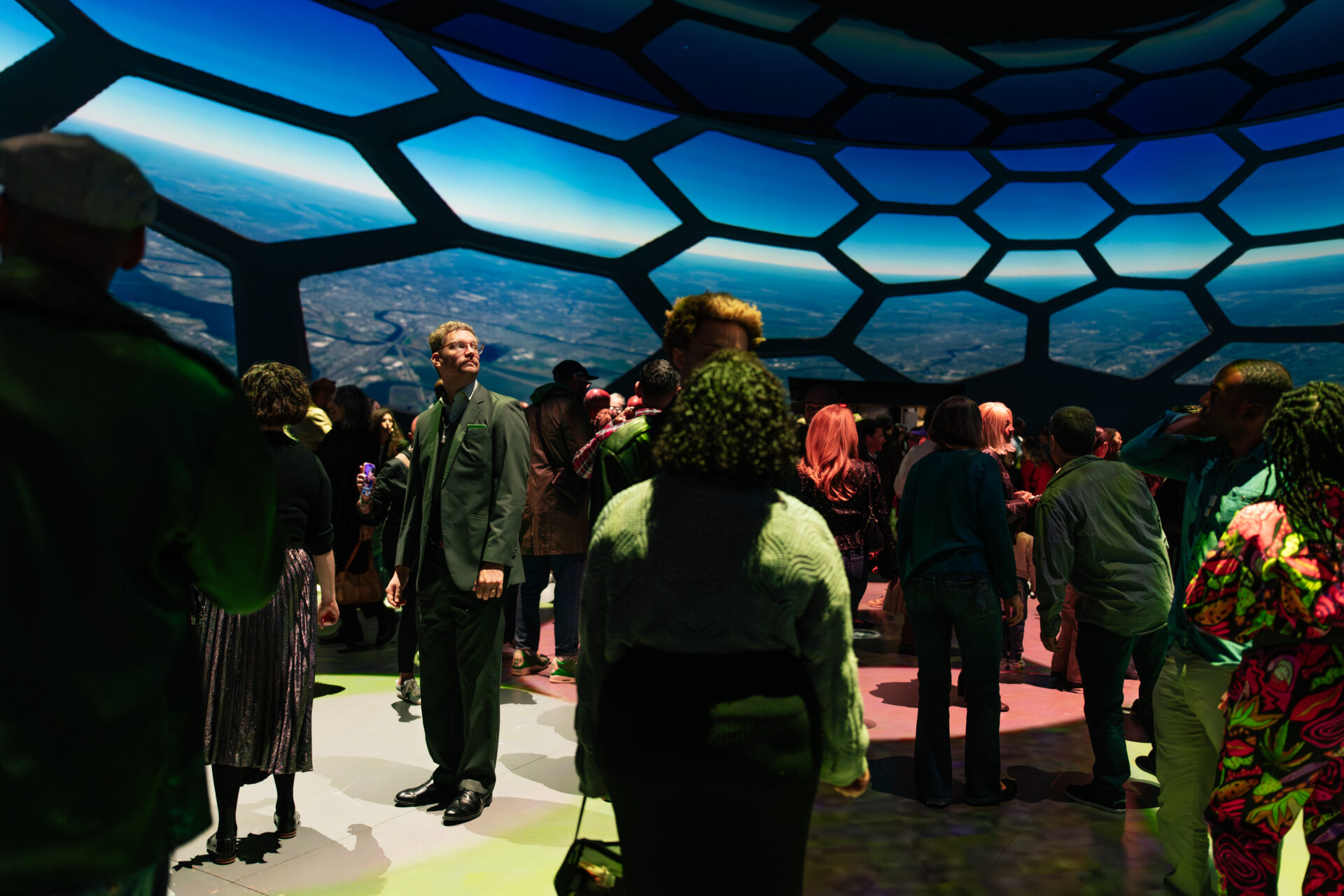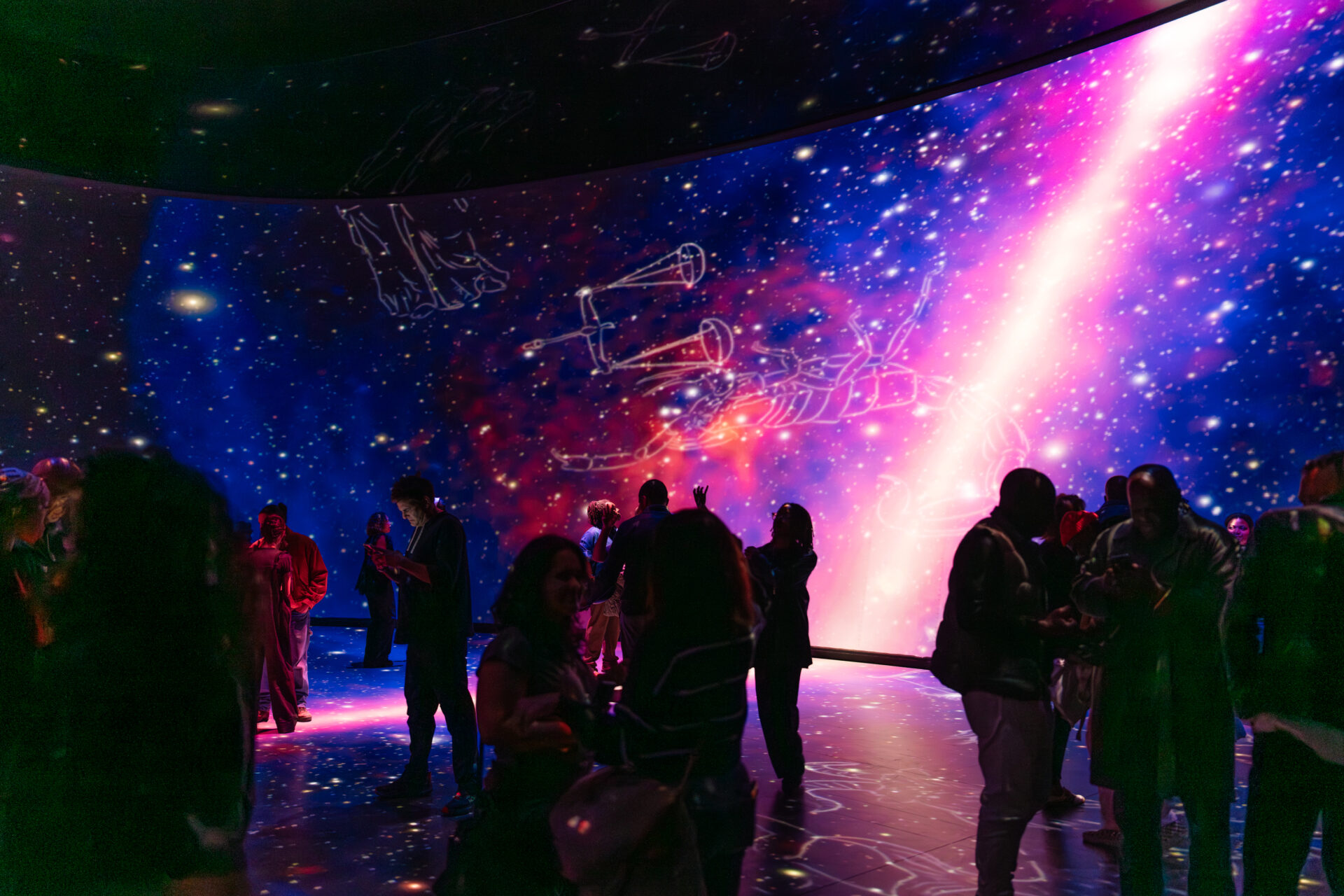 The group was then ushered into AMNH’s Invisible Worlds Theater, where the performance transformed into an interstellar voyage. The Invisible Worlds space is one of the most advanced immersive projection environments on the planet. It is an interactive, 360-degree science and art experience that displays more than 100 million pixels projected onto a 23-foot circular wall from 16 projectors, visualizing scientific data on interconnected life throughout the galaxy—enhanced with room-shaking immersive audio from 62 speakers.