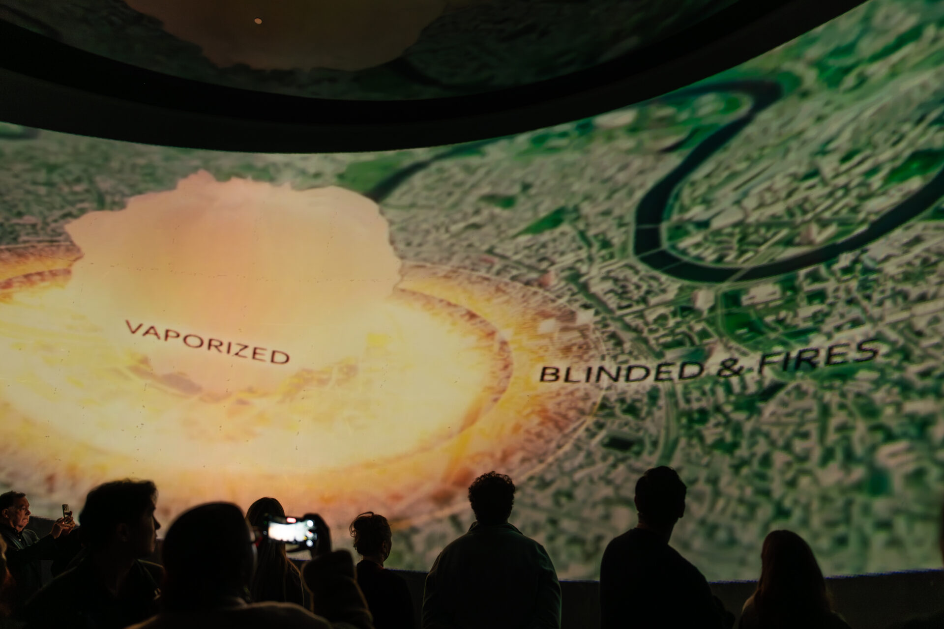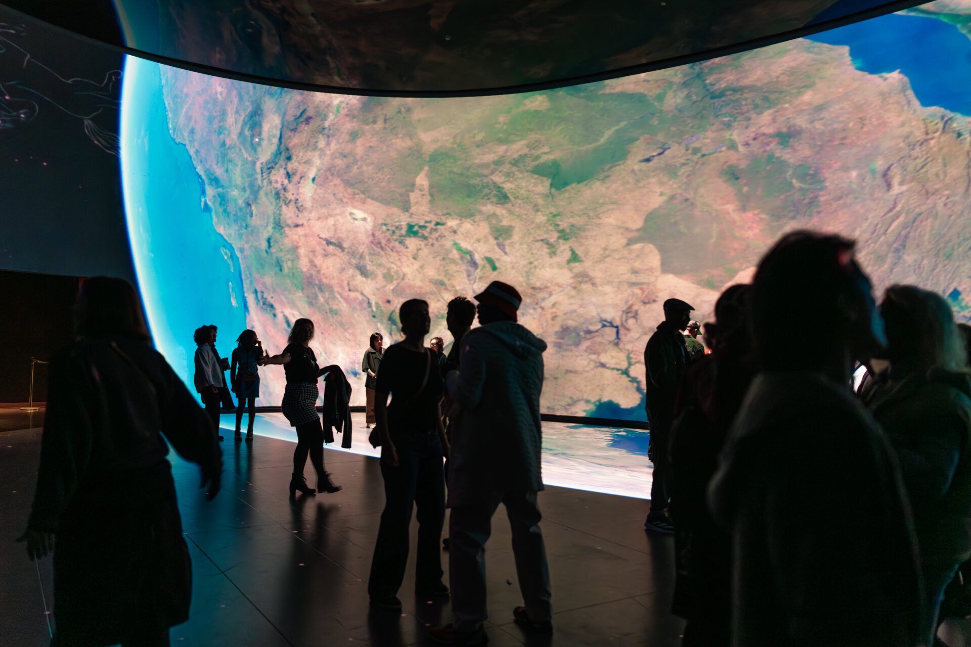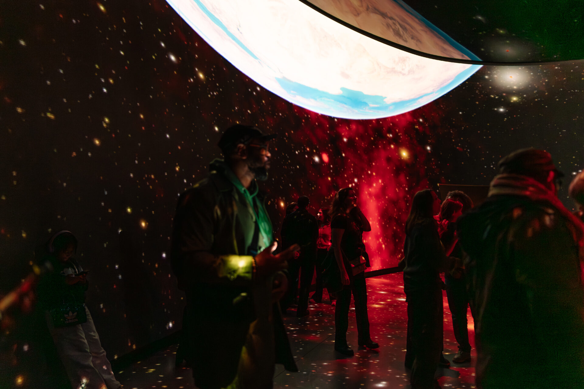 The group was then ushered into AMNH’s Invisible Worlds Theater, where the performance transformed into an interstellar voyage. The Invisible Worlds space is one of the most advanced immersive projection environments on the planet. It is an interactive, 360-degree science and art experience that displays more than 100 million pixels projected onto a 23-foot circular wall from 16 projectors, visualizing scientific data on interconnected life throughout the galaxy—enhanced with room-shaking immersive audio from 62 speakers.