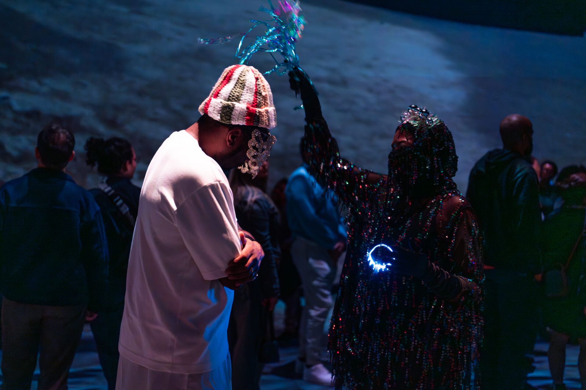 The performance began in the Gilder Center with a powerful reimagining of “Nuclear War,” Sun Ra’s haunting anti-war anthem. This version—originally released on the Red Hot + Ra remix album—featured MoonMedicin and the legendary DJ Rich Medina, now brought to life in a theatrical, spatially dynamic staging.